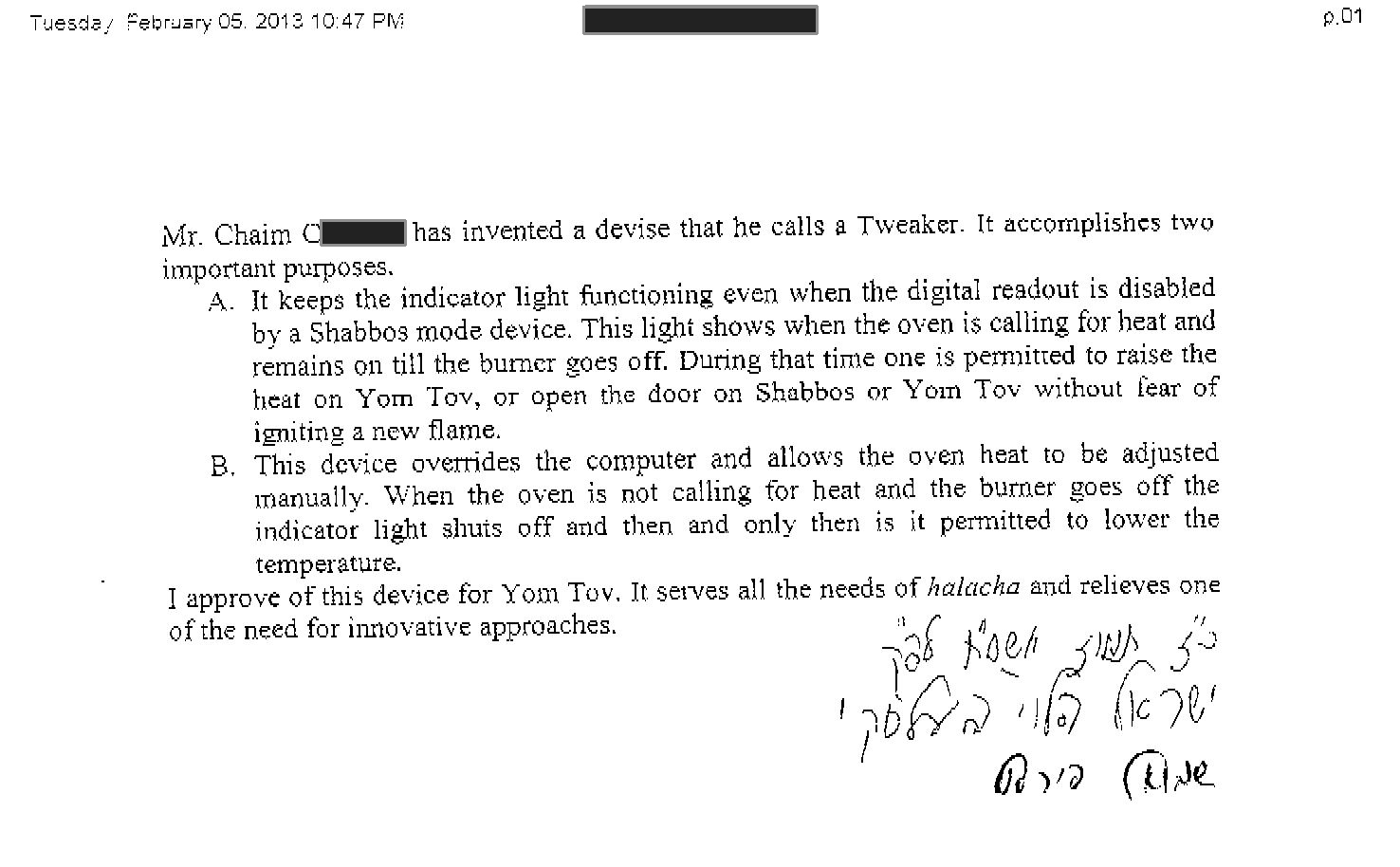 My original Tweaker design, which doesn't require any additional enhancements, previously approved by Rabbi Yisroel Belsky has also received approval by Dayan Shmuel Fuerst, shlita of the Agudas Yisrael Illinois. There was an updated article has Dayan Fuerst's signature in addition to Rav Belsky. endorsed hechsher This was to remove any doubt that was any disagreement between Rav Fuerst and Rav Belsky in approving the full range Tweaker.